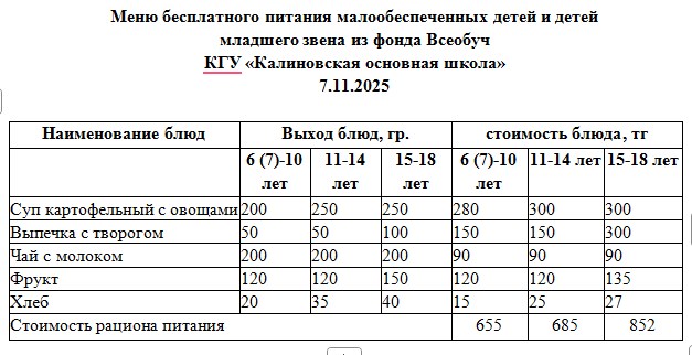Меню бесплатного питания малообеспеченных детей и детей младшего звена из фонда Всеобуч КГУ «Калиновская основная школа» 7.11.2025 Автор admin Чтение мин Число просмотров 12 Опубликовано 07/11/2025