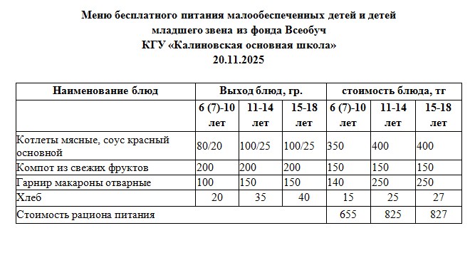 Меню бесплатного питания малообеспеченных детей и детей младшего звена из фонда Всеобуч КГУ «Калиновская основная школа» 20.11.2025 Автор admin Чтение мин Число просмотров 6 Опубликовано 20/11/2025