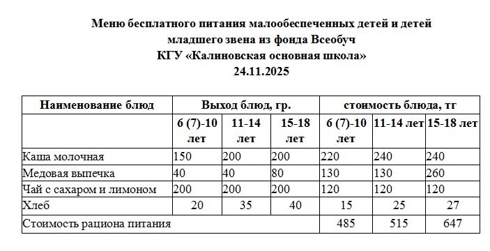 Меню бесплатного питания малообеспеченных детей и детей младшего звена из фонда Всеобуч КГУ «Калиновская основная школа» 24.11.2025 Автор admin Чтение мин Число просмотров 7 Опубликовано 24/11/2025