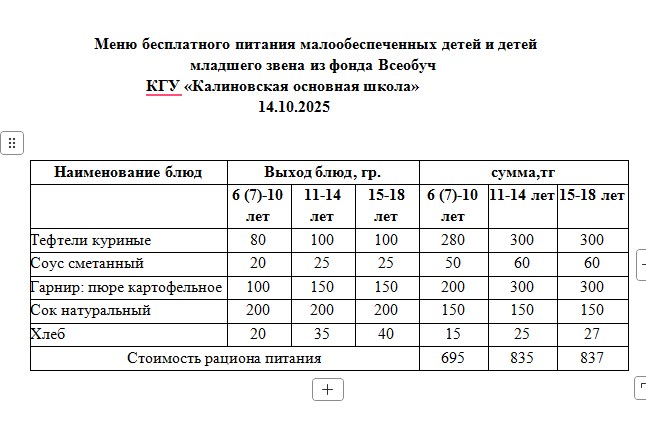 Меню бесплатного питания малообеспеченных детей и детей младшего звена из фонда Всеобуч КГУ «Калиновская основная школа» 13.10.2025 Автор admin Чтение мин Число просмотров 23 Опубликовано 13/10/2025